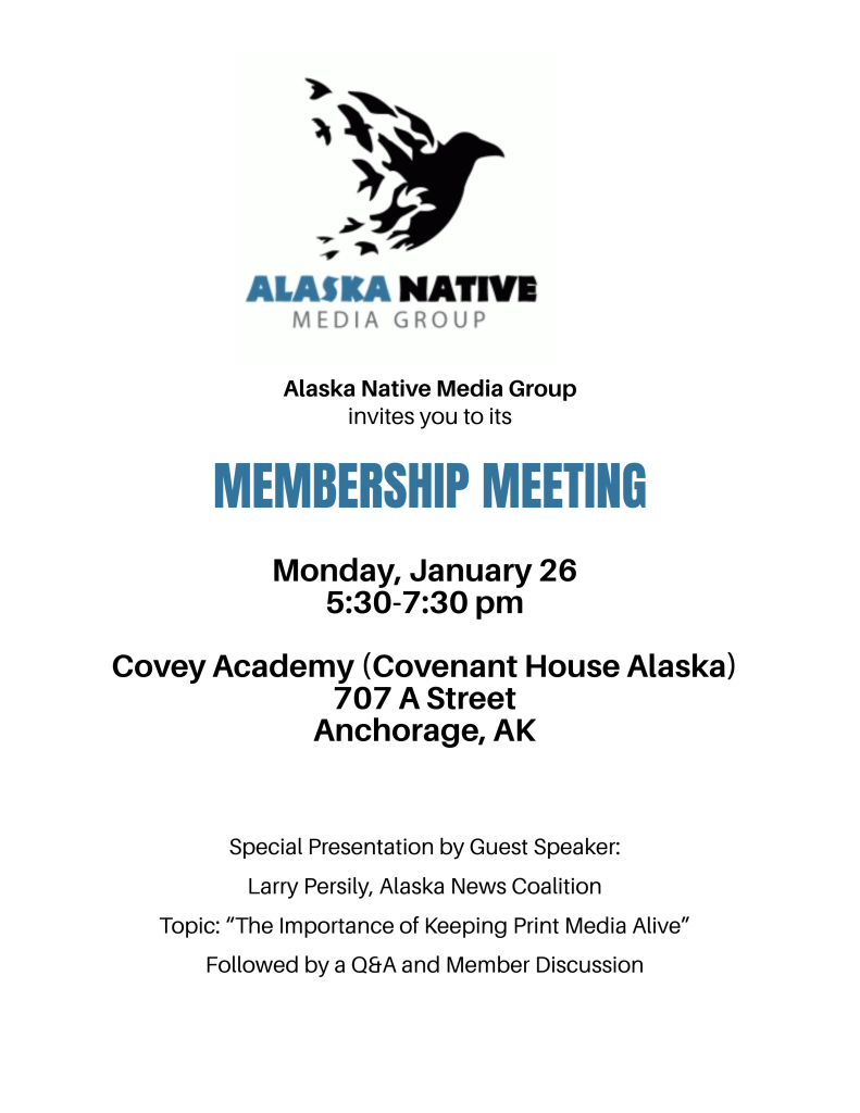Join the Alaska Native Media Group for our Membership Meeting on Monday, Jan. 26 (5:30–7:30 pm) at Covey Academy (Covenant House Alaska), featuring guest speaker Larry Persily of the Alaska News Coalition on “The Importance of Keeping Print Media Alive,” followed by Q&A and member discussion.